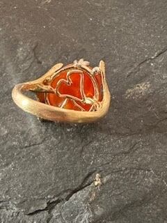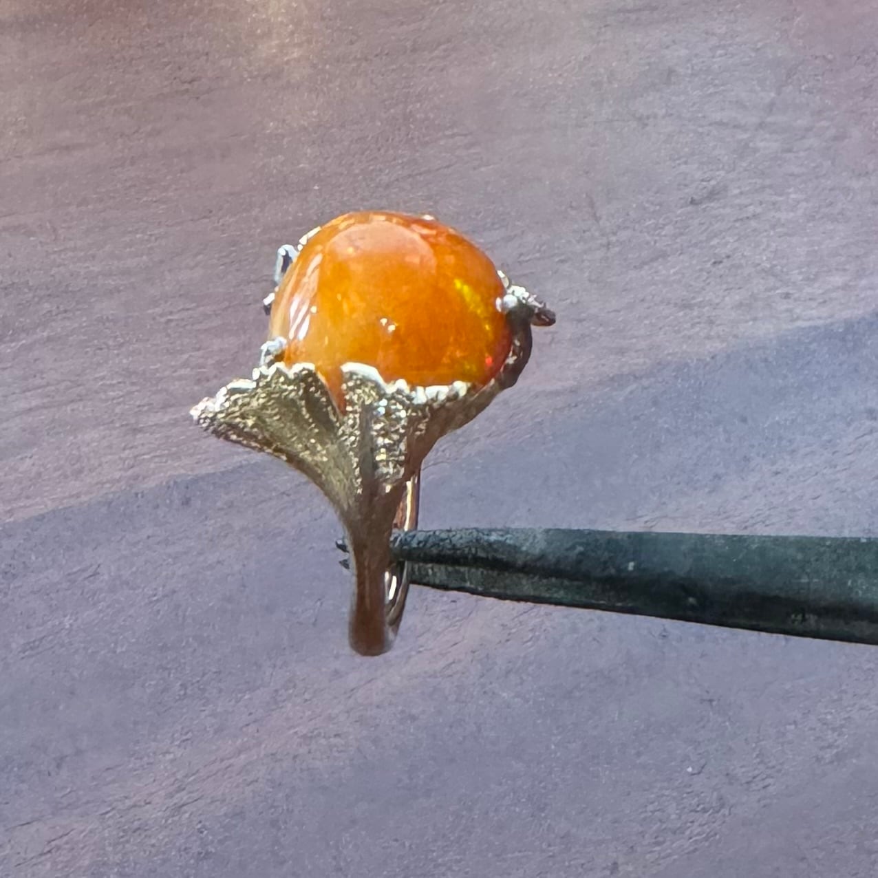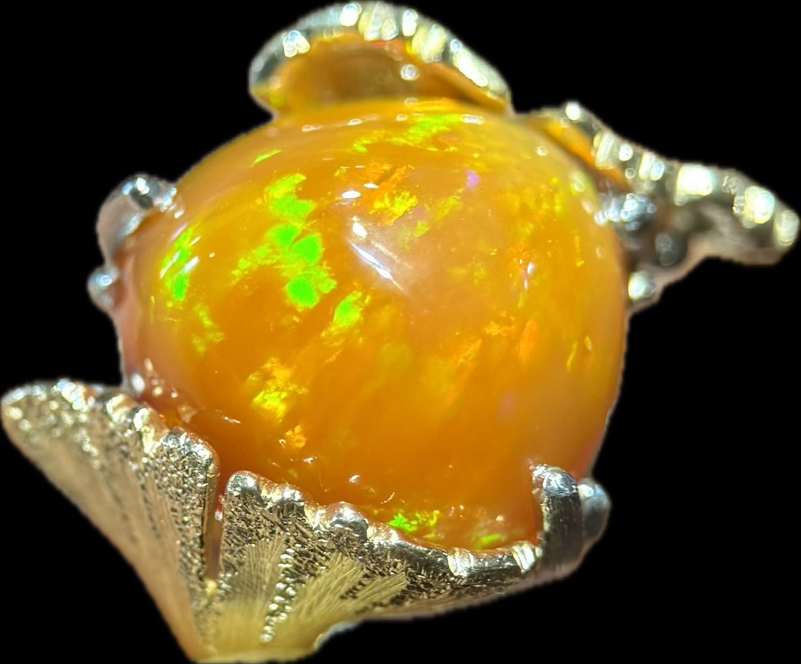 大ぶりなファイヤオパールを銀杏の葉で包みました。